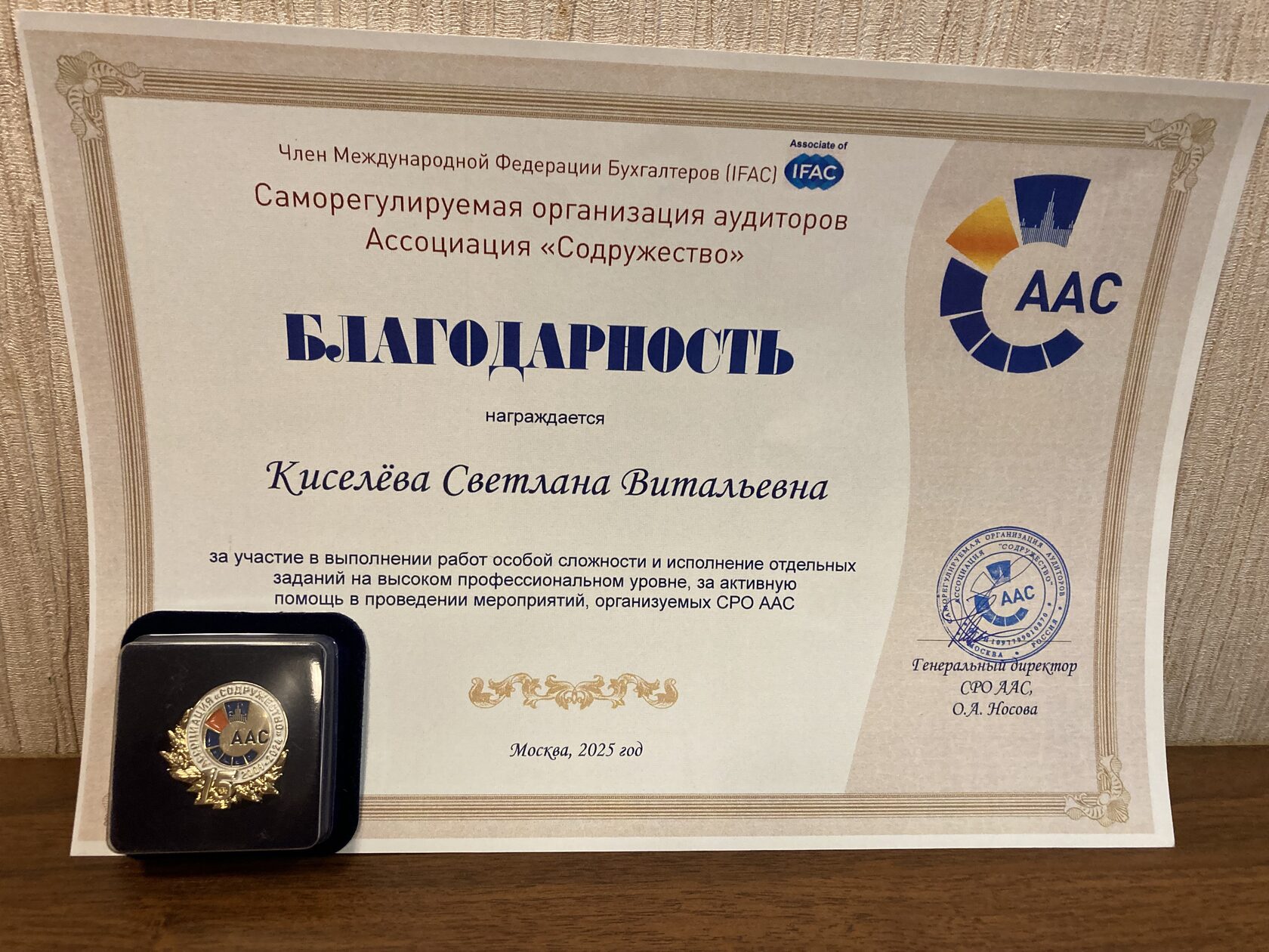 Генеральному директору Аудиторской фирмы «ВнешЭкономАудит» Светлане Киселевой вручили юбилейный знак и благодарность от Саморегулируемой организации аудиторов Ассоциации «Содружество» за вклад в профессию, за участие в сложных проектах, за активность и вовлечённость.